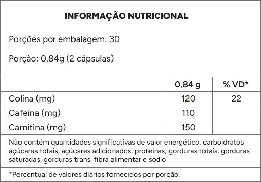 Frasco 2 - INGREDIENTES: tartarato de l-carnitina, guaraná em pó (Paullinia cupana), bitartarato de colina, cafeína, agente de massa celulose microcristalina (INS 460i), antiumectantes estearato de magnésio (INS 470iii) e dióxido de silício (INS 551). Composição da cápsula: gelatina e corantes amarelo crepúsculo (INS 110), azorrubina (INS 122), azul brilhante (INS 133) e dióxido de titânio (INS 171). NÃO CONTÉM GLÚTEN